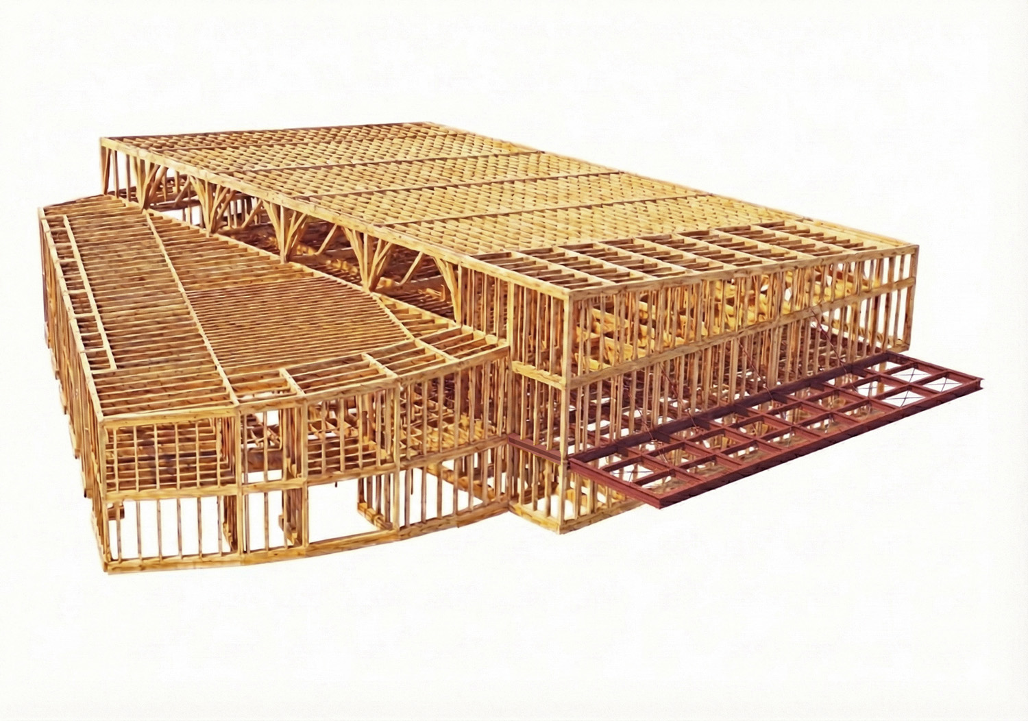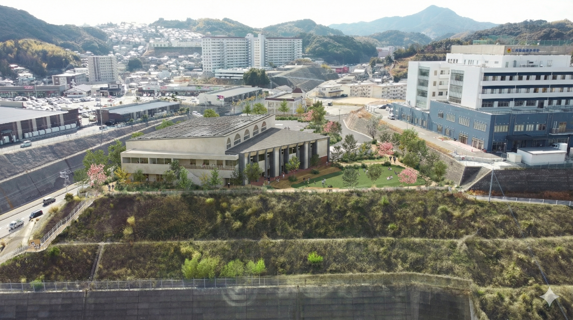 長崎県長与町に計画する、延床面積約3,000㎡の2階建て複合公共施設。図書館と健康センターという異なる用途を複合し、人や本や情報が交錯する新しい公共空間を構想した。構造は、図書館としては国内初となるメンブレン式耐火木造を採用し、さらに図書館としては同じく国内初となるfullZEB認証を取得予定。環境性能と持続性を高い次元で両立している。世代や立場、目的の異なる人々が自然に交わり、思いがけない出会いが生まれる「まちの交差点」として、誰もが自分らしく過ごせる寛容でインクルーシブな居場所を目指す。(2027年4月開館予定)